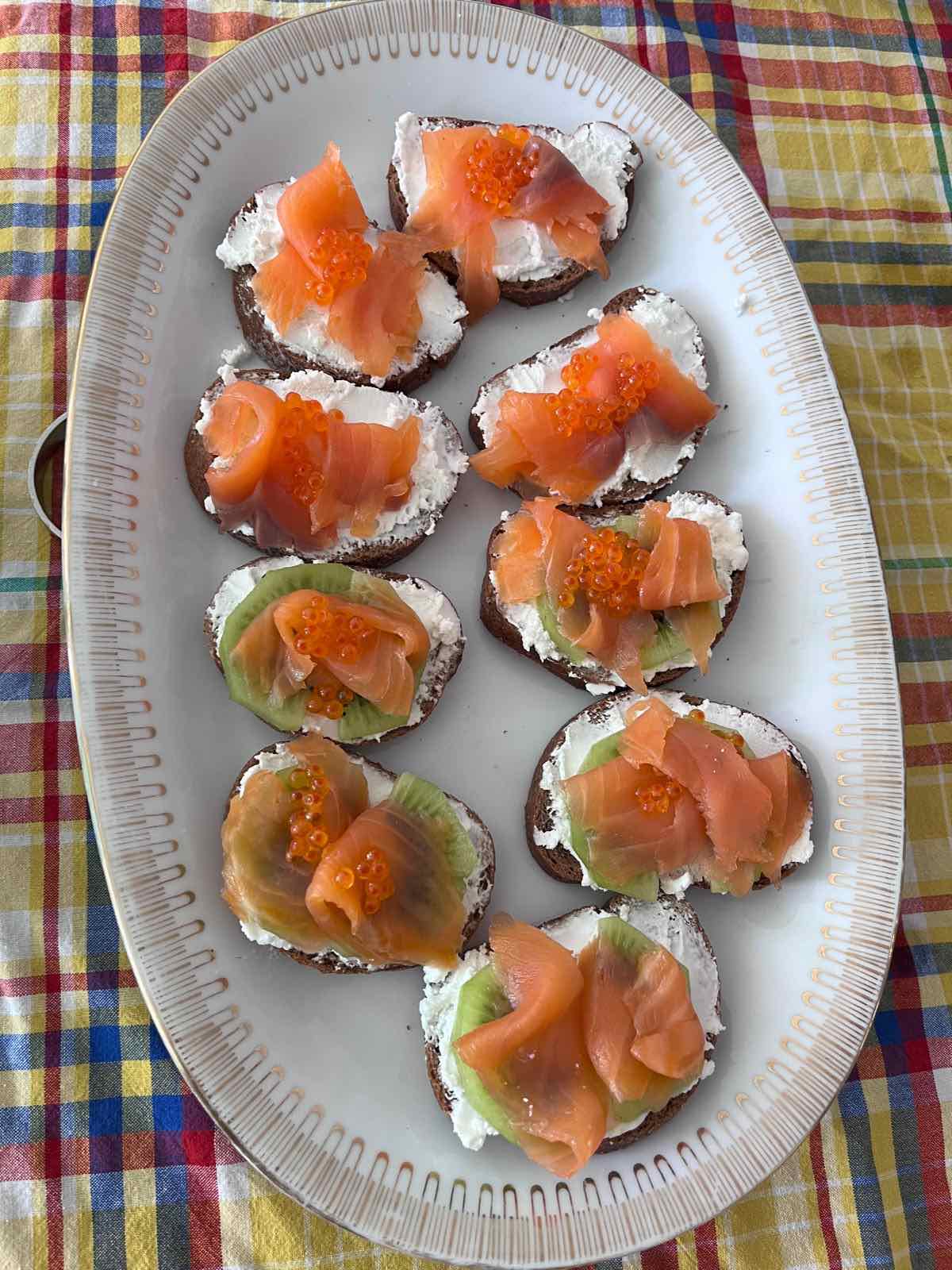 Apéro: Toast chèvre frais / truite fumée / kiwi