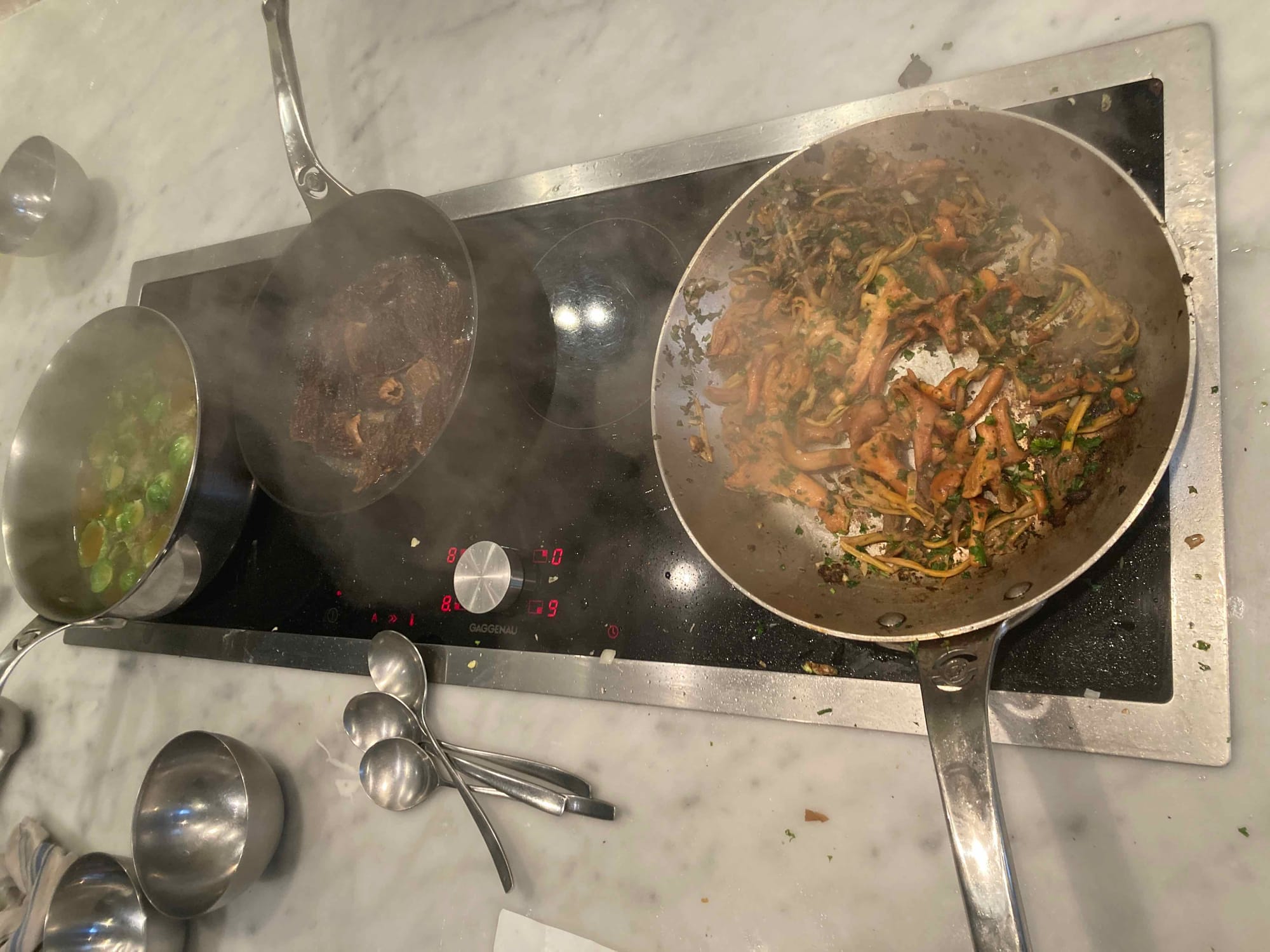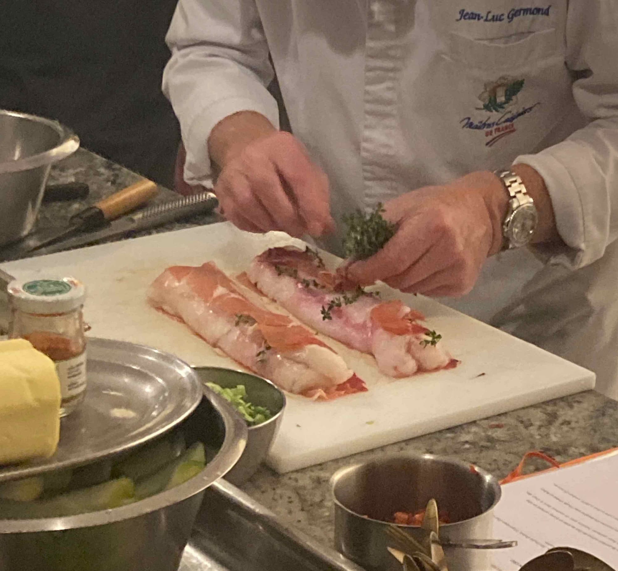 - Participation à un atelier cuisine de Jean-Luc Germond (chef 1 étoile). Le cours était sur les poissons et coquillages. Nous avons fait une royale de fenouil aux oursins, du bar et chorizo, et de la lotte et aubergines.