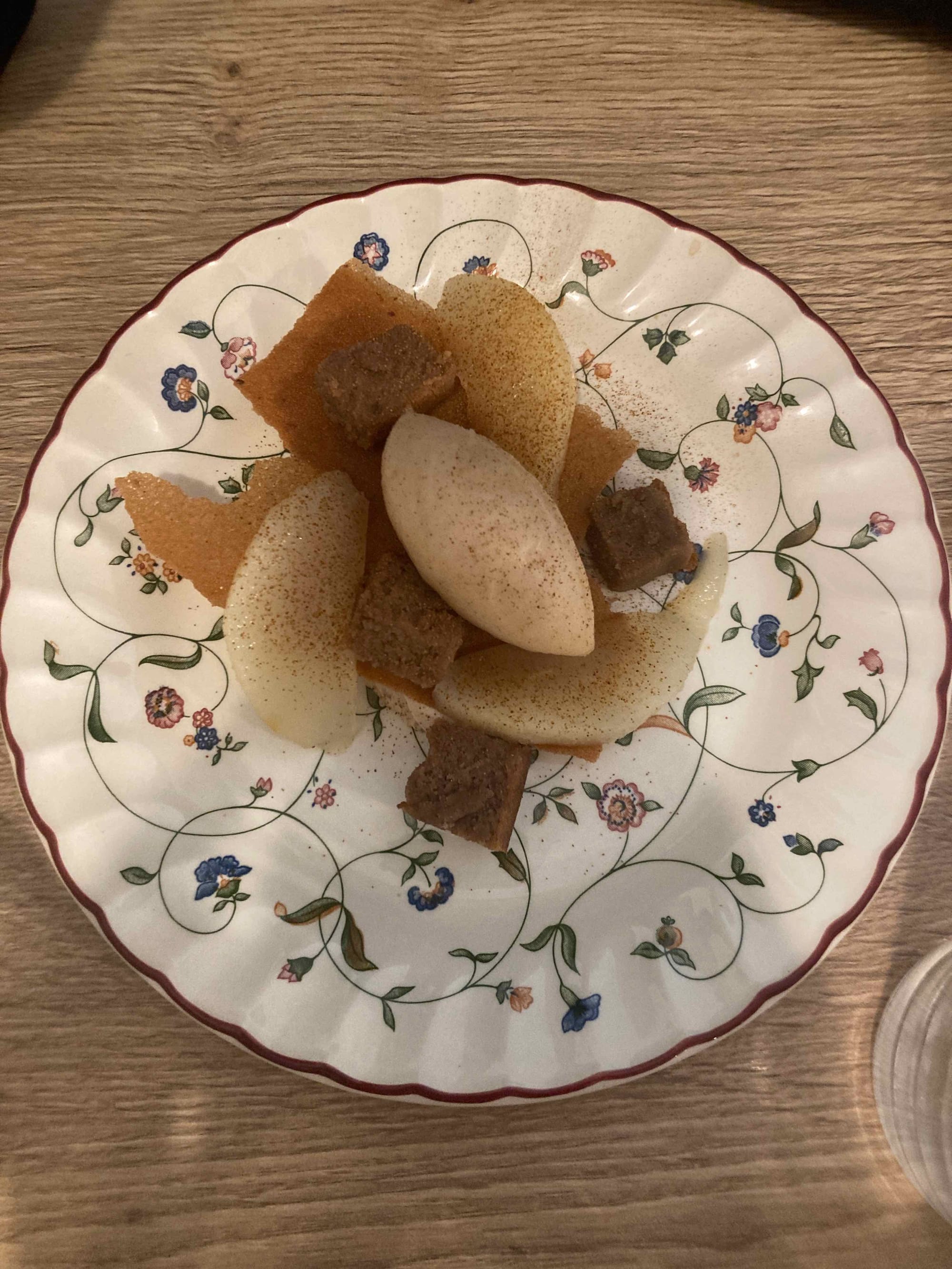 Le dessert du restaurant Milprée. Un gâteau aux marrons, tuile pralinée, glace noisette, poires pochées à la bergamote et mousse châtaigne. Clairement un délice!