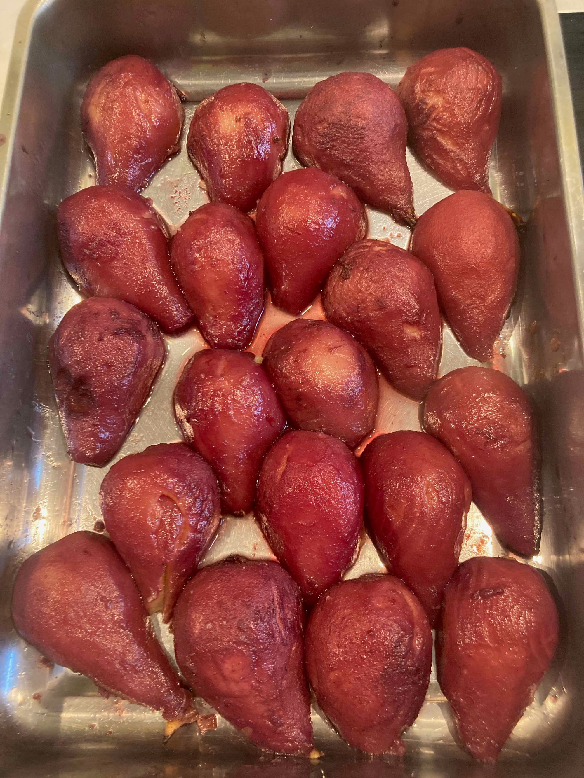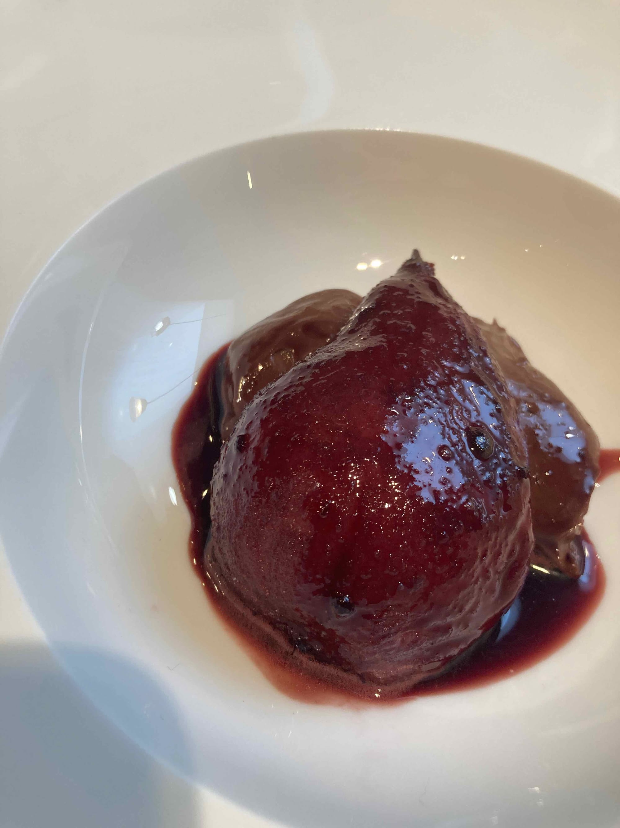 Dessert: Poire pochée au vin rouge et crémeux chocolat / clémentines