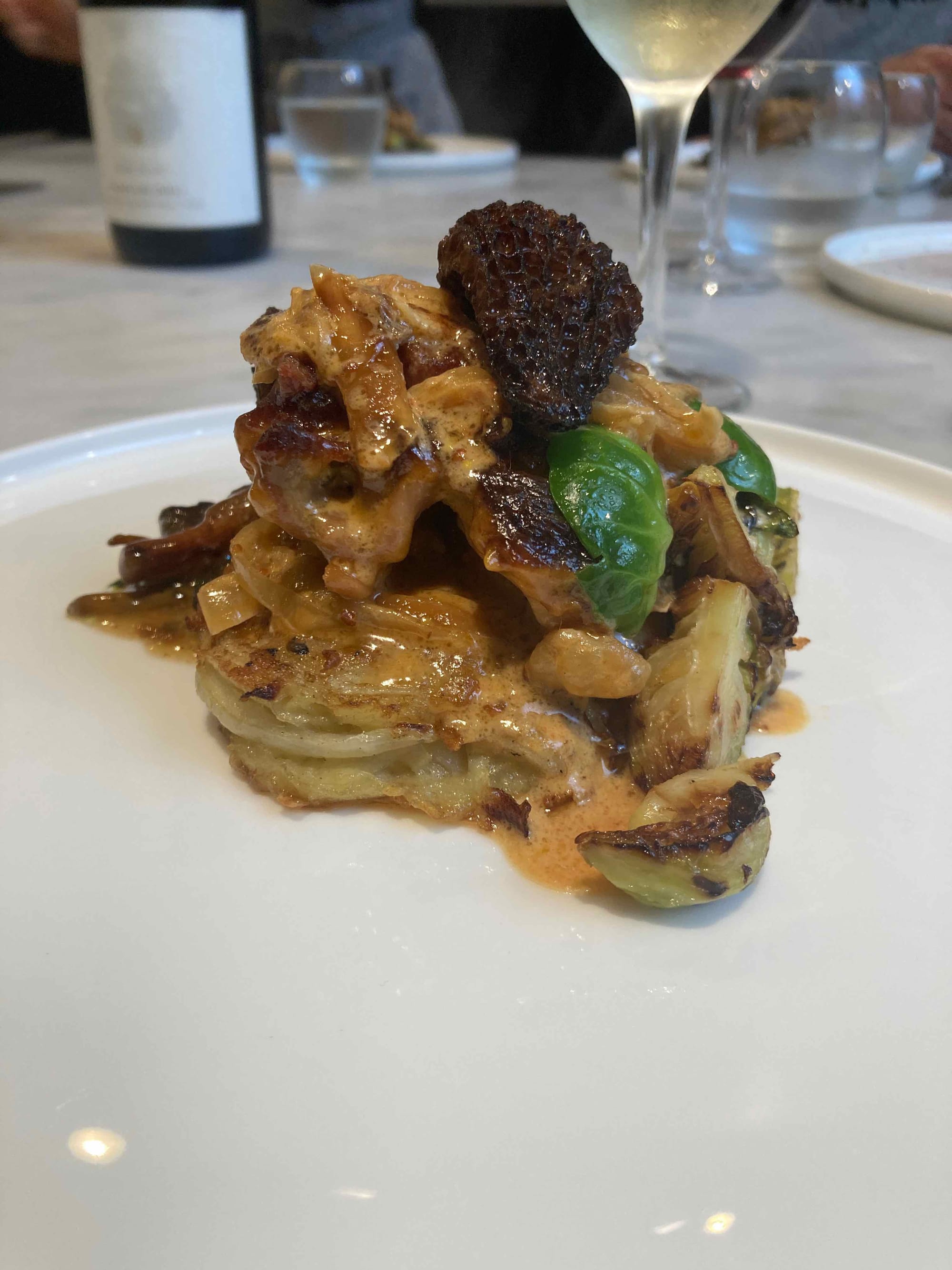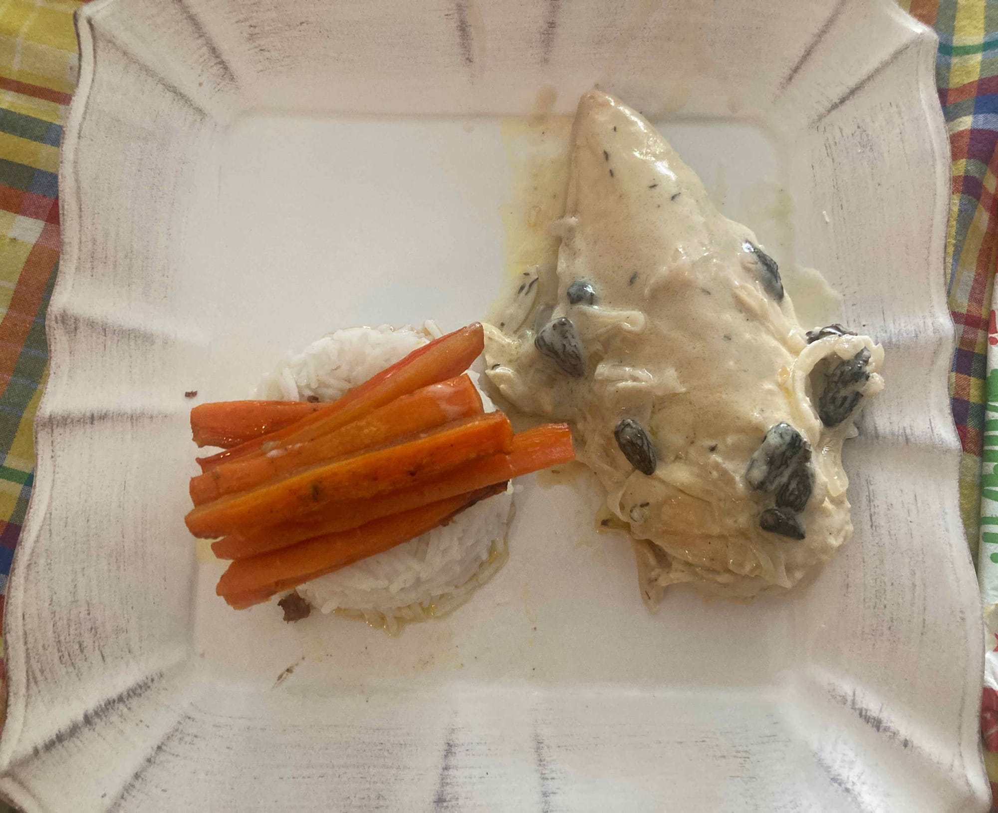 Plat: Poularde vin jaune et morilles avec carottes roties au miel
