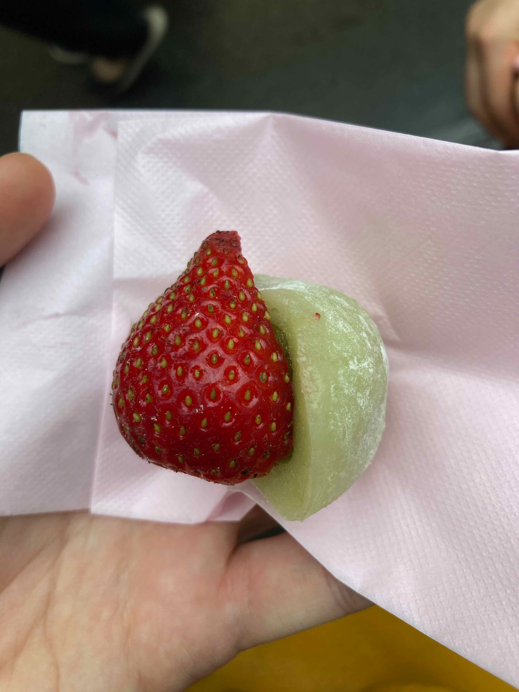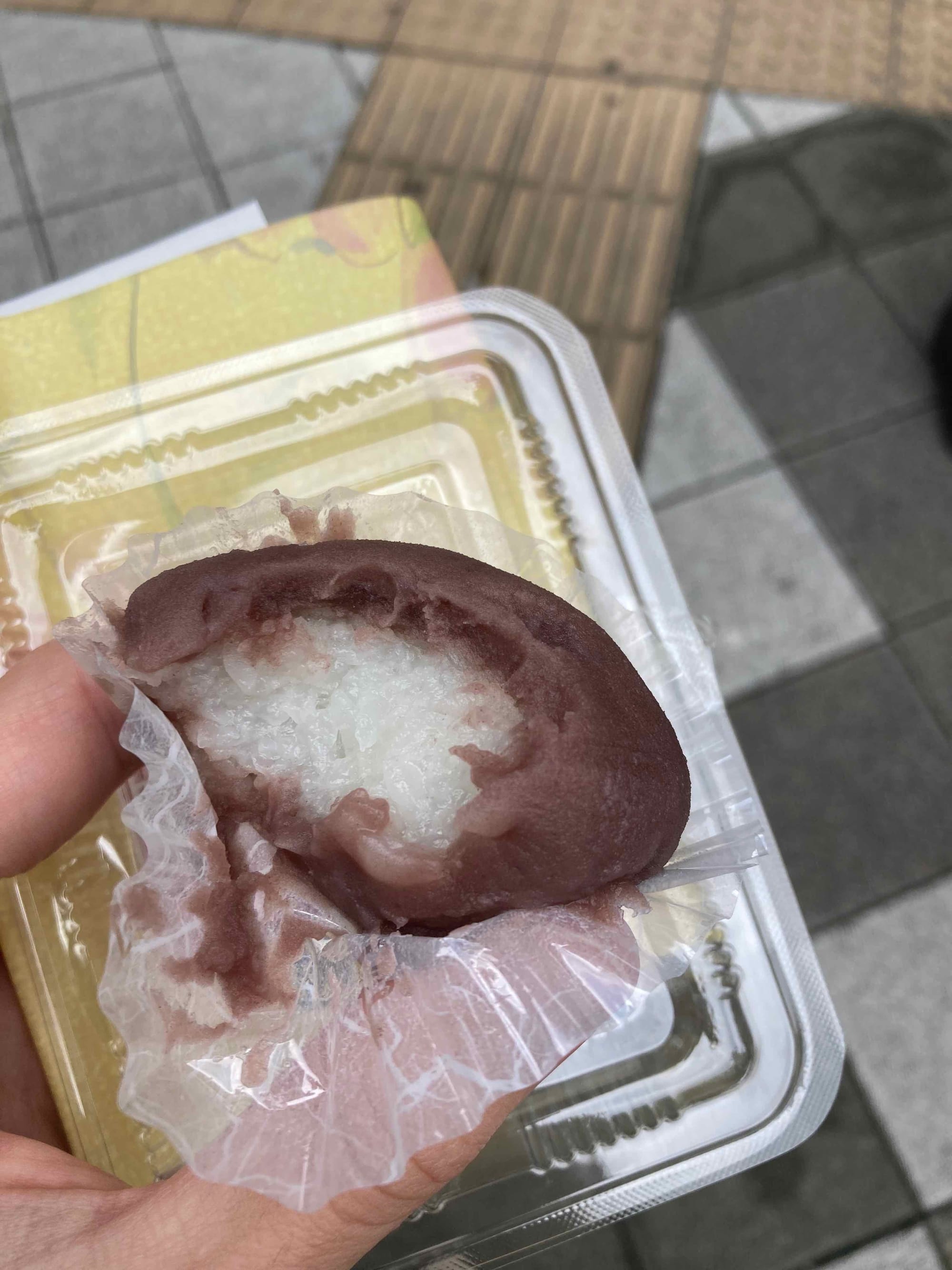 Une fois en bouche, il ne fait qu'un avec le palais. Les dents se fondent petit à petit dans la pâte de riz. La mâchoire effectue des mouvements latéraux et laisse le mochi se détendre. Ce dernier libère enfin sa saveur cachée: la pâte d'haricots rouges... Ce goût légèrement sucré vient réhausser la douceur du mochi.
