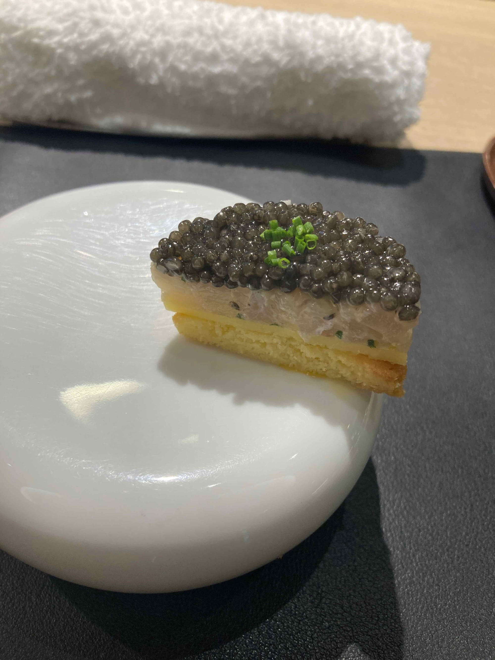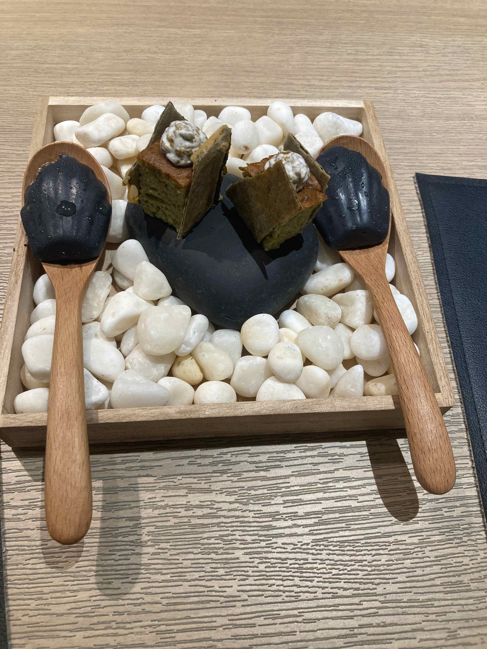 Nous sommes accueillis par le responsable de salle qui nous conduit à nos places. Vue sur une partie de la cuisine et aux premières loges du dressage des assiettes, nous sommes chanceux. Nous échangeons quelques mots avec le chef en même temps que nos amuse-bouches arrivent. Des petites madeleines aux olives noires accompagnées d'un mini cake aux algues. Un délice ! La suite est prometteuse.