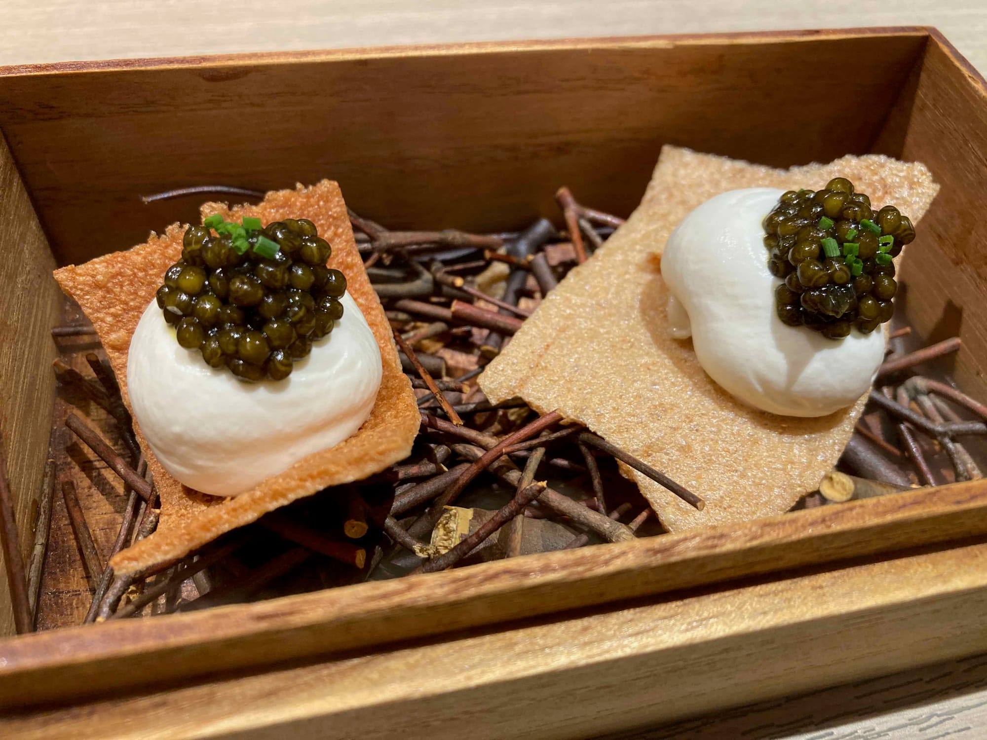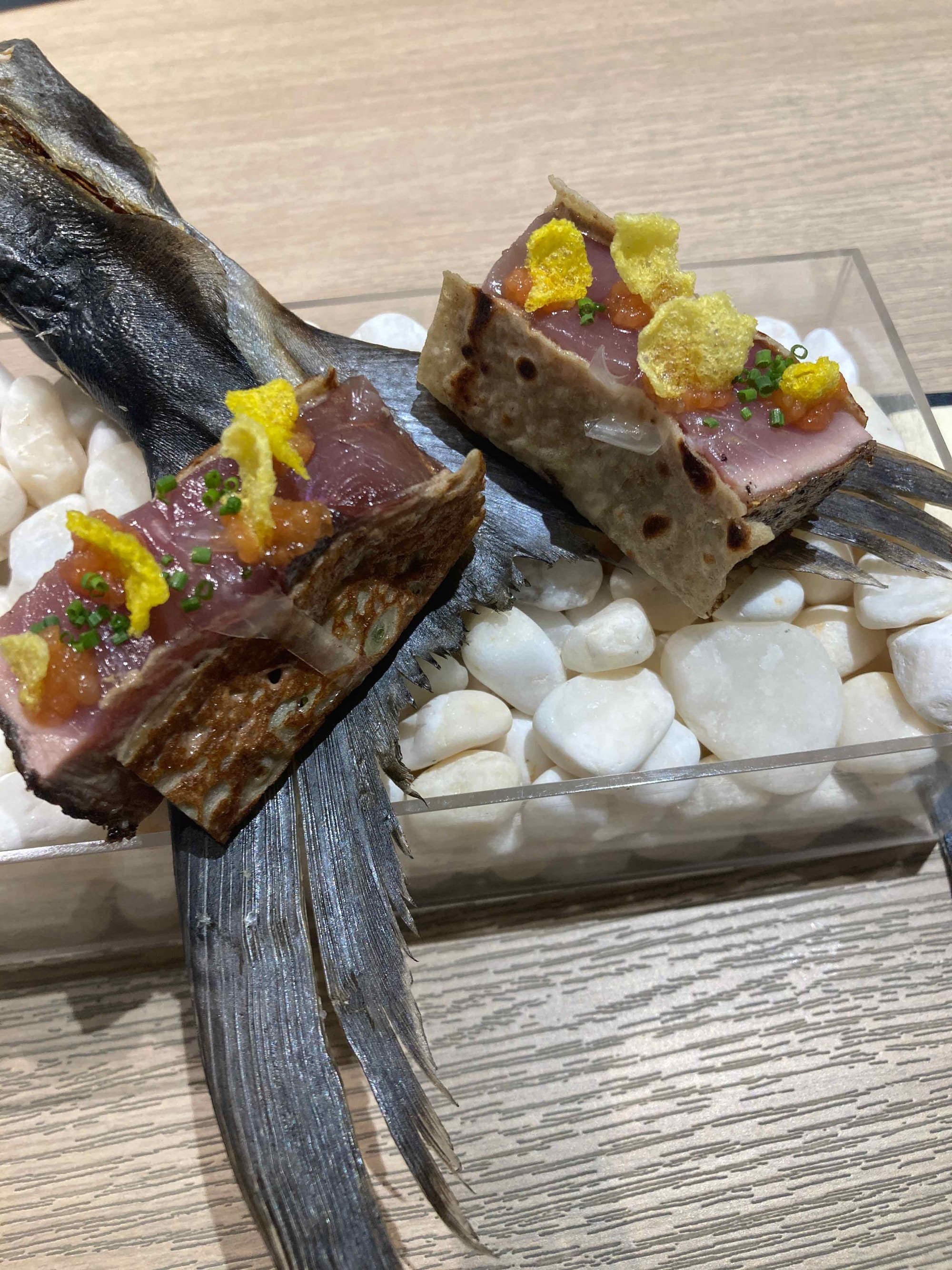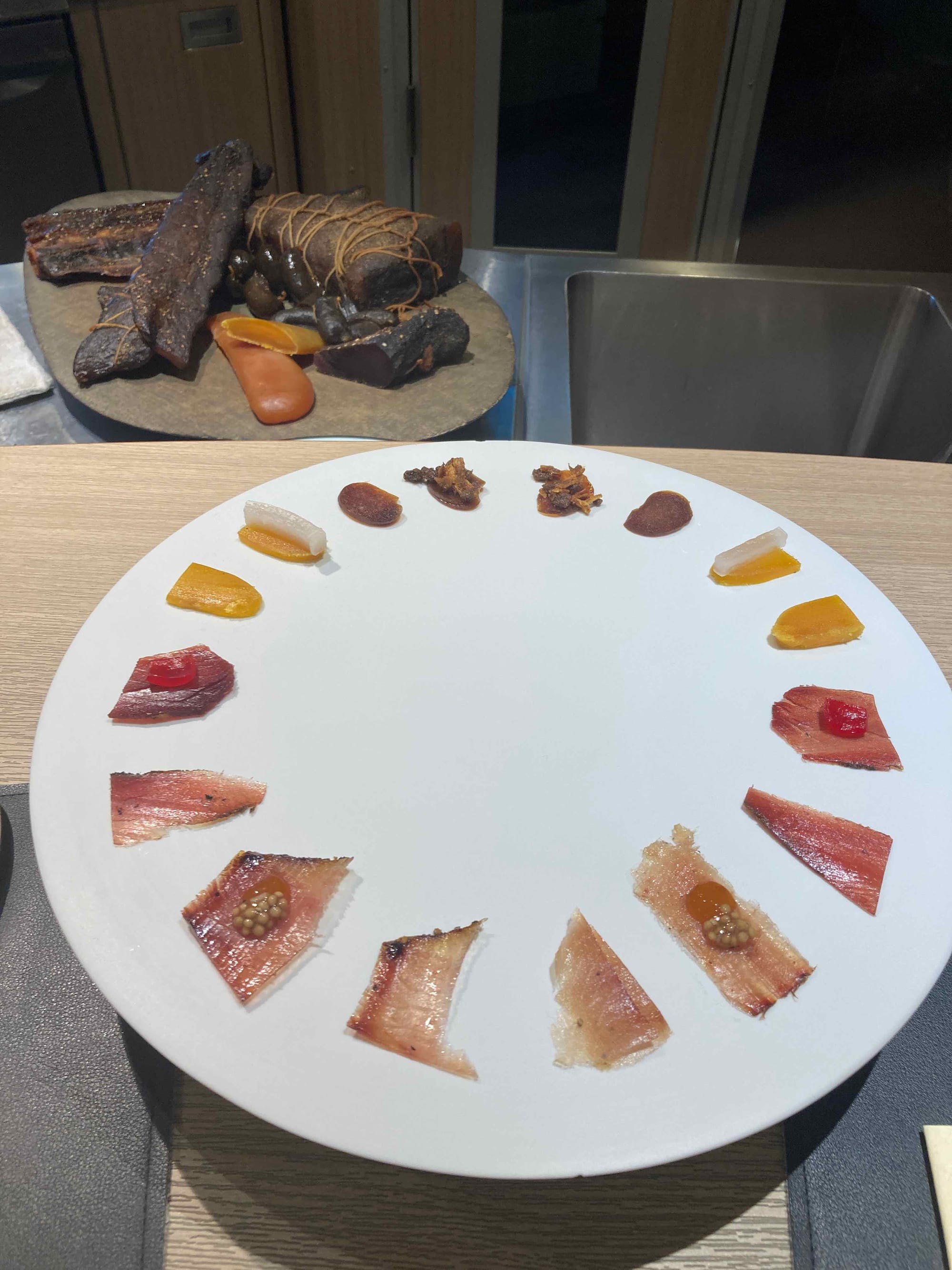 S'ensuit une dégustation de charcuterie de poissons. Le chef est spécialisé dans le poisson et confectionne ses charcuteries. Chaque morceau est sublimé par un condiment minutieusement sélectionné (yuzu, moutarde japonaise, pickles,...).