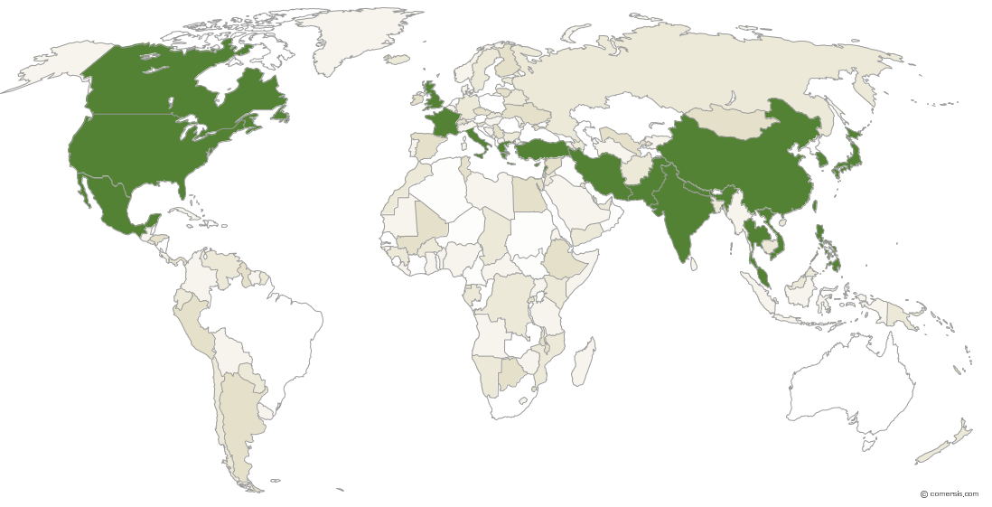 Canada, Etats-Unis, Mexique, Royaume-Uni, France, Italie, Grèce, Turquie, Liban, Iran, Pakistan, Inde, Népal, Chine (région du Canton et de Shanghai), Thaïlande, Malaisie, Vietnam, Corée du Sud, Taïwan, Philippines, Japon