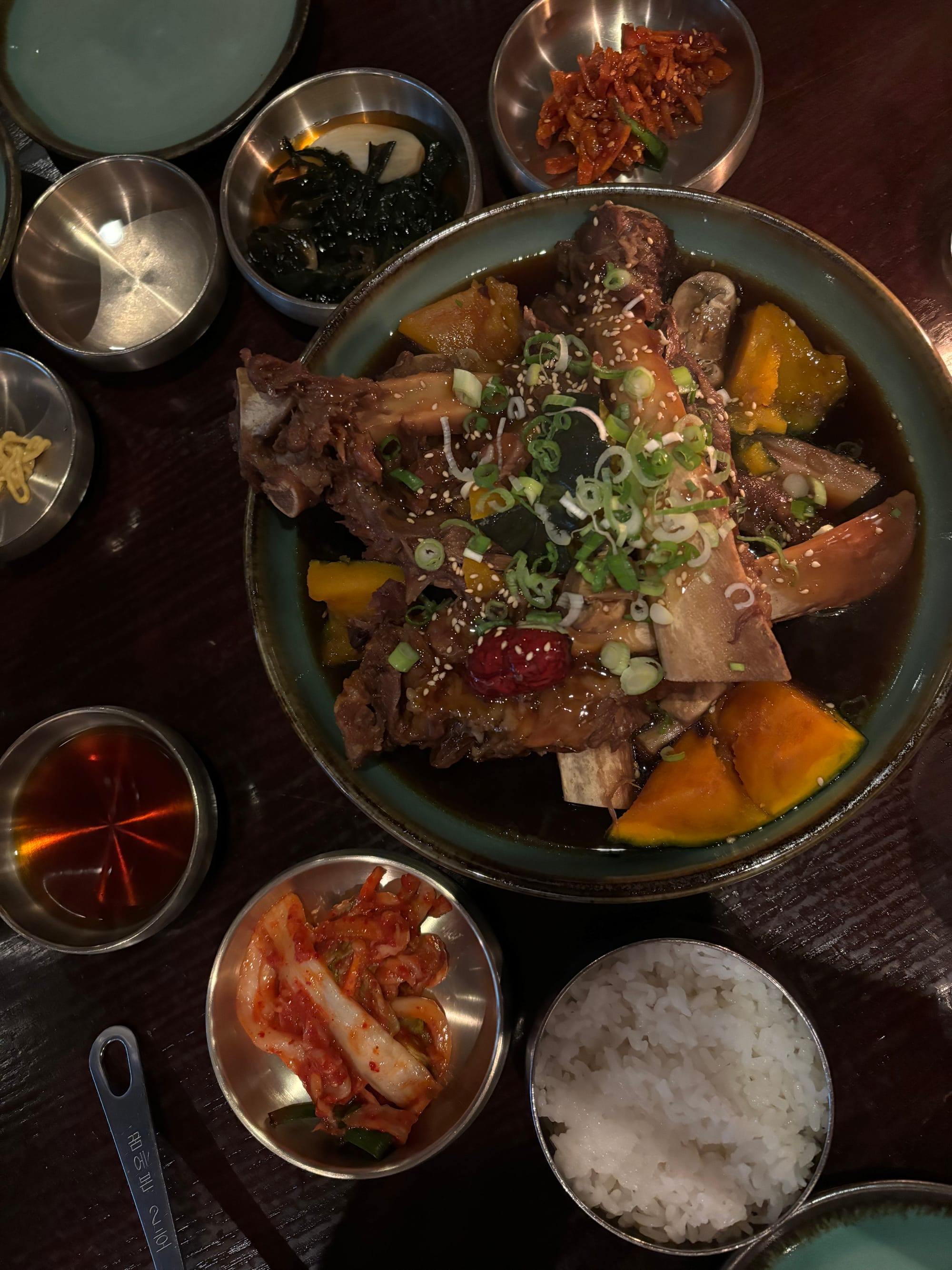 Des petits côtes de boeuf mijotées avec de la courge et des champignons dans une sauce onctueuse aux épices et au soja. Le fondant de la courge, du boeuf et de la sauce épaisse, sucrée et soyeuse sont à tomber par terre.